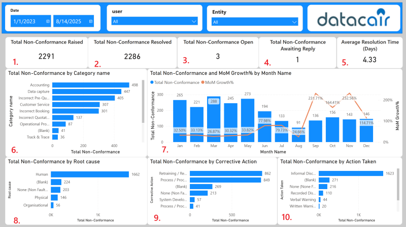 | 10. Total Non-Conformance by Action | Total Non-Conformance = DISTINCTCOUNT('Performance and Root Cause'[id]) | This visual presents the total number of non-conformance cases categorized by the Action taken against employee taken to resolve them, using a stacked bar chart. Each bar corresponds to a grouping (such as entity, month, or category, depending on active filters), and each colored segment within the bar represents a specific Action taken. |