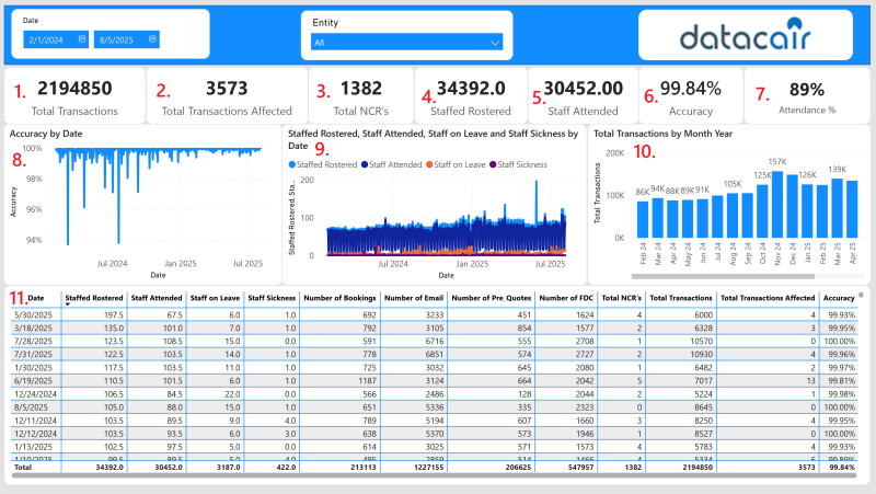 ii. Staffed Rostered iii. Staff Attended iv. Staff on Leave v. Staff Sickness vi. Number of Bookings vii. Number of Emails viii. Number of Prequotes ix. Number of FDC x. Total NCRs xi.Total Transactions xii. Total Transactions Affected xiii. Accuracy |