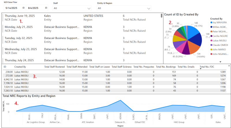 Filters data based on entities (business units) and regions where NCRs were recorded, allowing users to view staff involvement in non-conformance incidents specific to selected entities and geographic regions.