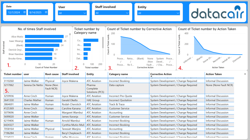 | 1. Number of ticket by Staff involved | Total Ticket number=COUNT('Performance and Root Cause'[Ticket Number)] | This metric represents the number of times various staff members have been involved in non-conformance incidents, calculated by counting the occurrences of unique ticket numbers associated with staff in the non-conformance records. |